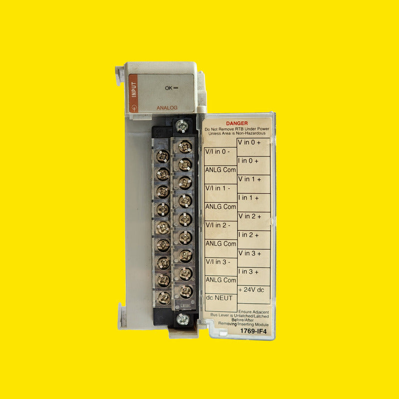 Módulo Allen Bradley 1769-IF4 Entradas Analógicas PLC _____________________________________________________ -Módulo de entradas analógicas Allen-Bradley serie CompactLogix -Modelo 1769-IF4 de 4 entradas analógicas -Compatible con PLC CompactLogix y MicroLogix 1500 -Tipos de señal: voltaje y corriente analógica -Rangos típicos: 0–10 V, ±10 V, 0–20 mA, 4–20 mA -Resolución analógica de alta precisión para control industrial -Conversión rápida de señales para procesos continuos -Aislamiento entre canales para mayor seguridad -Montaje directo en riel DIN con módulos 1769 -Alimentación a través del bus del sistema -Indicadores LED de estado por canal -Ideal para sensores, transmisores y control de procesos -Uso en automatización industrial y control de maquinaria -Date: 2015/05/09 Y 2016/12/27 Condición: Usado Sin Caja Facturamos, el precio incluye IVA 17/12/25DS