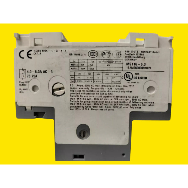 DESCRIPCION: ABB Ms116-6.3. 4,0-6,3A (1SAM250000R1009) Corriente operativa nominal: 6.3 A. Voltaje de operación: 230V AC, 400V AC, 440V AC, 500V AC, 690V AC. Capacidad de corte de cortocircuito de servicio (Ics): 50 kA a 230V AC y 400V AC, 6 kA a 440V AC, 2 kA a 500V AC y 690V AC. Clase de disparo: 10A. Dimensiones: 45 mm de ancho, 90 mm de alto, 85.6 mm de profundidad. Peso: 0.265 kg. Número de polos: 3. Tipo de terminal: Terminales de tornillo. Grado de protección: IP20 para la carcasa, IP10 para los terminales del circuito principal. Aplicaciones: Protección y control manual de motores en aplicaciones industriales. CONDICION: NUEVO SIN CAJA FACTURAMOS EL PRECIO PUBLICADO YA INCLUYE IVA (AM 15-02-2025)